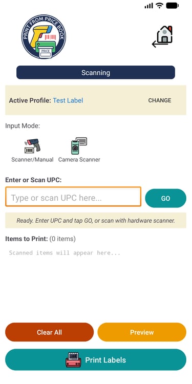 Scan any product barcode on the sales floor. The app pulls the item's name and price from your price book. Select your label profile and tap Print. Done.